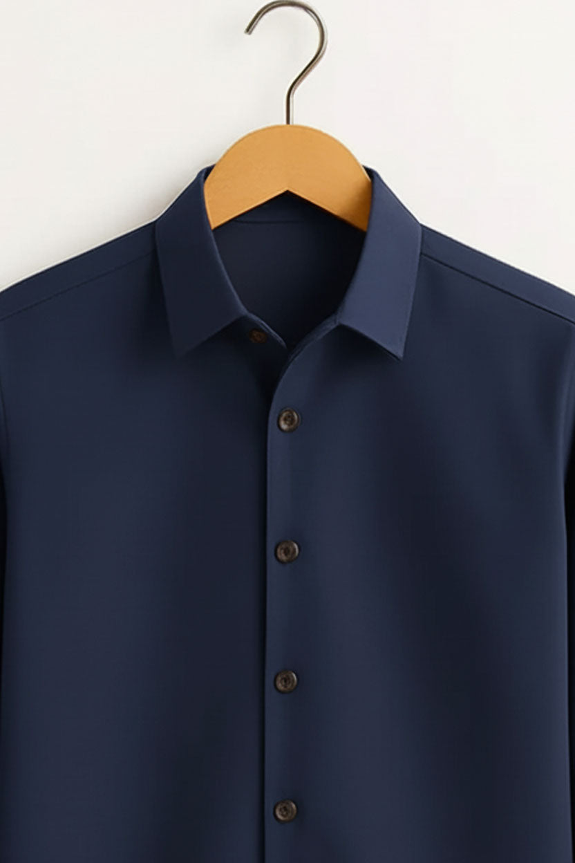 Experience timeless elegance with this Classic Navy Blue Stitchless Placket Shirt, crafted from premium 100% cotton fabric for all-day comfort and breathability. The smooth texture and refined lilac tone make it a versatile choice for both formal and casual occasions.