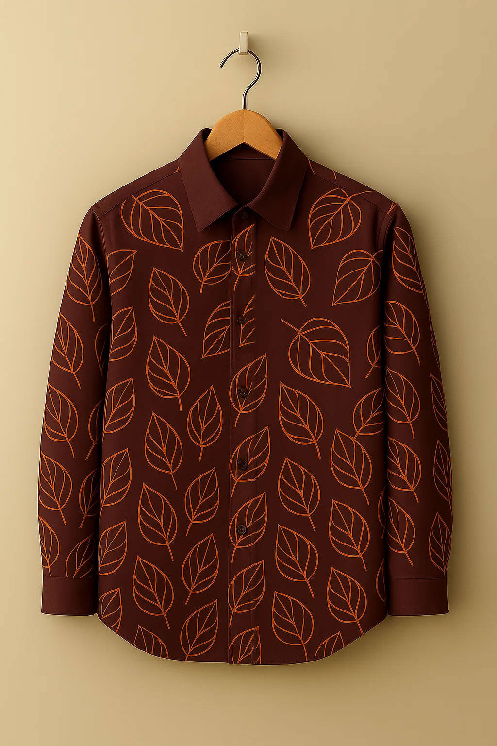 This Brown Leaf Print Shirt for Men features an elegant orange leaf pattern inspired by nature. The plain brown collar and cuffs add a touch of balance and sophistication, highlighting the shirt’s refined craftsmanship. Designed for both style and comfort, it’s perfect for festive occasions or casual evenings.