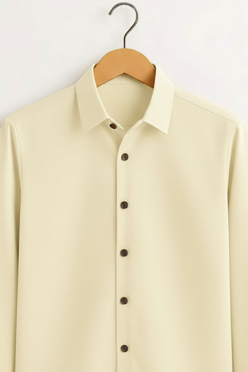 Experience timeless elegance with this Pastel Yellow Stitchless Placket Shirt, crafted from premium 100% cotton fabric for all-day comfort and breathability. The smooth texture and refined lilac tone make it a versatile choice for both formal and casual occasions.